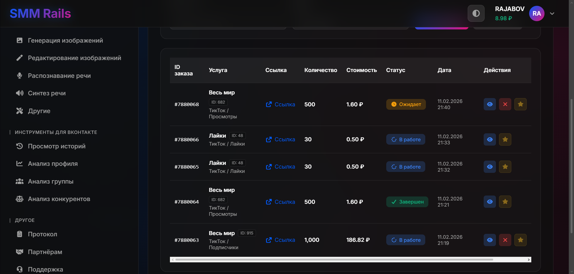 SMMRails - это платформа, предоставляющая широкий спектр услуг по продвижению в социальных сетях, включая накрутку подписчиков, лайков и просмотров. Сервис предлагает инструменты для SMM-специалистов, блогеров и маркетологов, а также AI-инструменты для создания и редактирования контента, генерации изображений и текста.